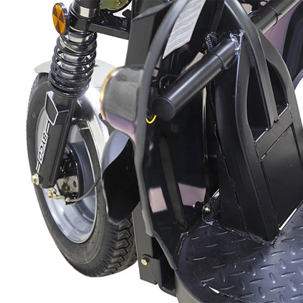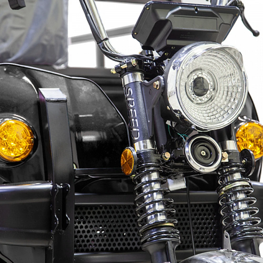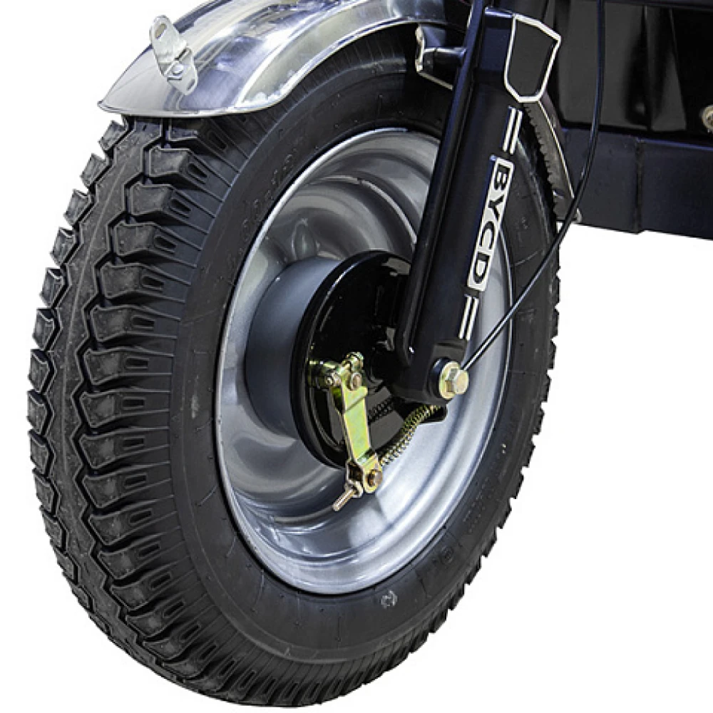 Электротрицикл оборудован гидравлической тормозной системой и амортизаторами, обеспечивающими плавность движение и отсутствие проблемой с преодолением препятствий. Транспорт имеет гарантию производителя (1 год).