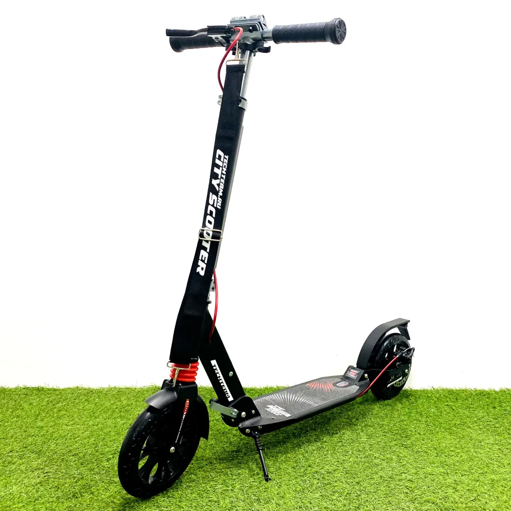 Визуально самокат ничем не отличается от взрослого. Модель оснащена мало стираемыми колесами, передними и задними амортизаторами, делающими движение плавным и беспроблематичным. Характеристики самоката обеспечивают безопасную скоростную езду по городской местности и парковой зоне.